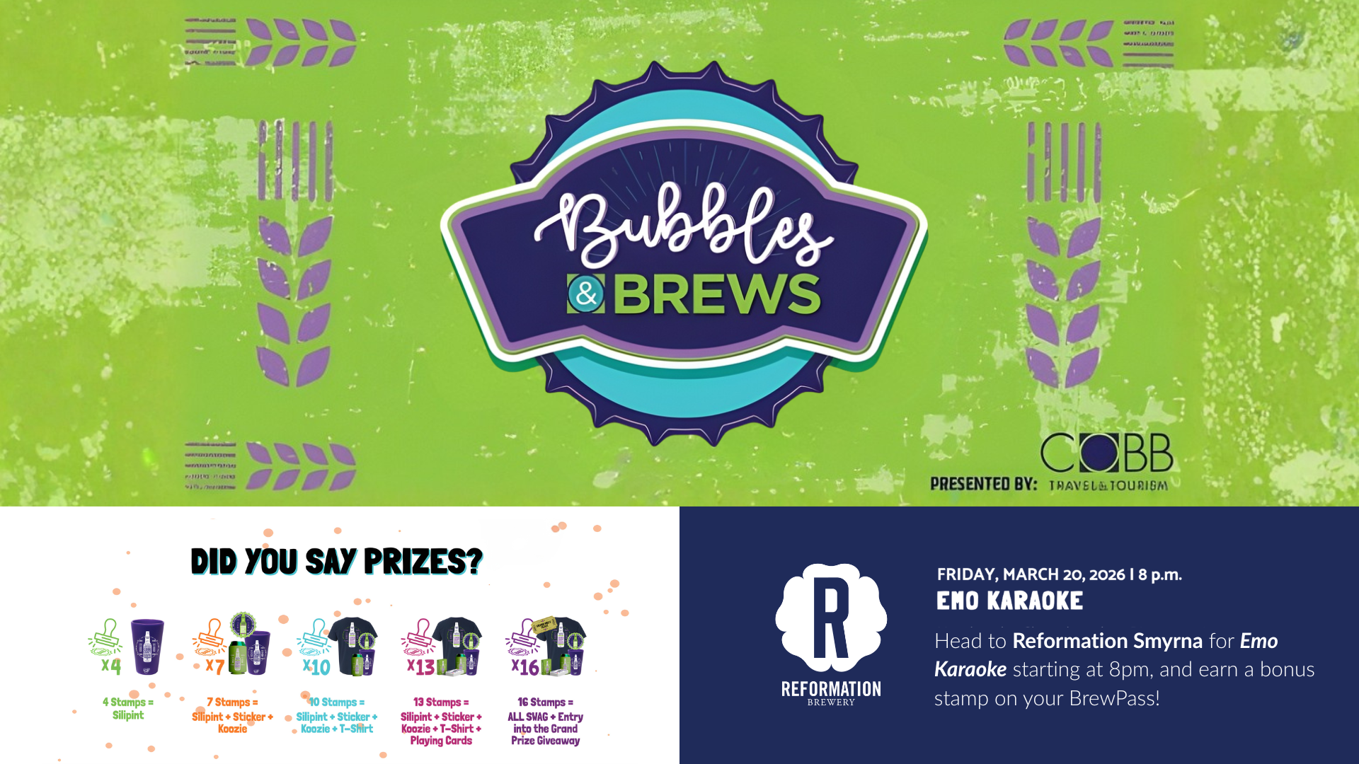 Bubbles and Brews is a month long celebration of Cobb’s breweries, wineries, and distilleries where you grab a BrewPass, visit participating Hop Spots, collect stamps, vote for your favorite beverage, and earn prizes along the way!